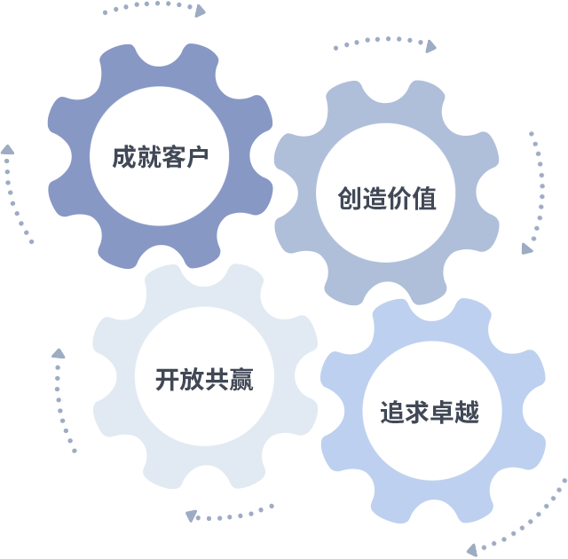 成就客户是一切决策的出发点,,,,创造价值是衡量所有工作的标准,,,追求卓越是304am永利做事做人的态度,,,,开放共赢是304am永利的格局也是最终的结果。。。。价值观的齿轮环环相扣,,推动着组织里的每个人不断向前。。